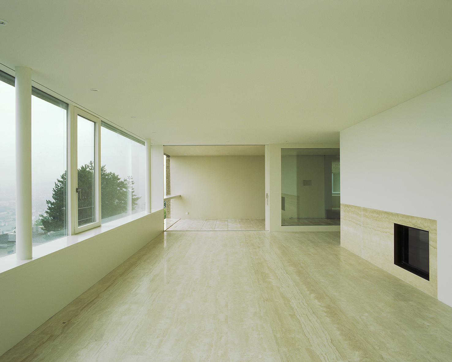 Drei Kerne, in welchen sich die Schlafzimmer, die Nasszellen und die Küche befinden, sind so angeordnet, dass ein fliessender Raum ausgeschieden wird. Dieses Raumkontinuum wird durch die Konstellation der drei Kerne in verschiedene Bereiche zoniert: In einen grossen Wohn- Essbereich, in einen Frühstücksbereich und in eine Bibliothek. Die Aussenräume reichen in Form von Loggien tief in den Grundriss. Durch das Wegschieben der raumhohen Fenster können diese Aussenräume im Sommer der Wohnung dazugeschlagen werden.